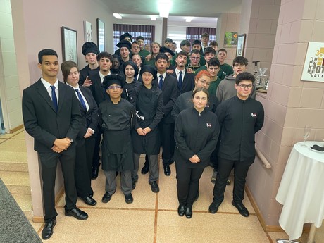 El menú servit pels alumnes d’ESCHOTUR l’han format deu plats amb snacks, entrants, peix, carn i postres. Per començar, s’ha servit entrants com Nigiri de croqueta de poma Salvatxina, cansalada ibèrica i kimchi; Pizza fregida de poma Caumasses i botifarra negra; Salmó marinat i fumat amb fusta de pomera, chutney de poma Brindilla Verda i torrades de canyella. Aquest plat s’ha elaborat amb un maridat curt del salmó i un fumat en fred amb fusta de pomera. Presentat en peça sencera i el filetejat a la taula, s’ha acompanyat d’un chutney de poma Brindilla Verda i torrades fines de pa amb canyella. Tot seguit, s’ha degustat Tàrtar de poma Caumasses, oli de nous i crema de formatge de cabra amb all negre, i Sorrentino de poma Salvatxina amb salsa cremosa de parmesà i oli de sàlvia, acabant el plat ratllant el formatge a la sala.